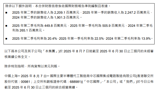 中芯国际周四公告,2025年第二季度销售收入22.09亿美元,环比下降1.7%。2025年第二季度毛利为4.5亿美元,环比下降11.1%。2025年第二季度毛利率为20.4%,环比下降2.1个百分点。