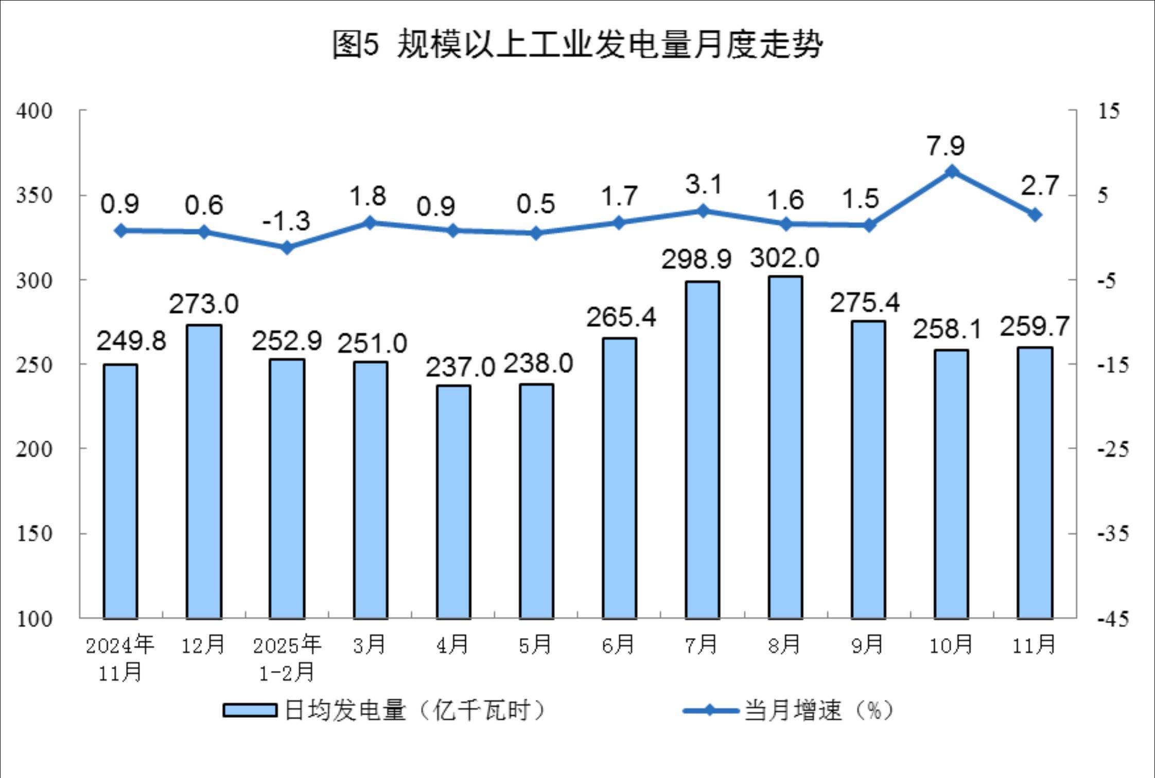 11月份,规上工业发电量7792亿千瓦时,同比增长2.7%;日均发电量259.7亿千瓦时。1—11月份,规上工业发电量88567亿千瓦时,同比增长2.4%。